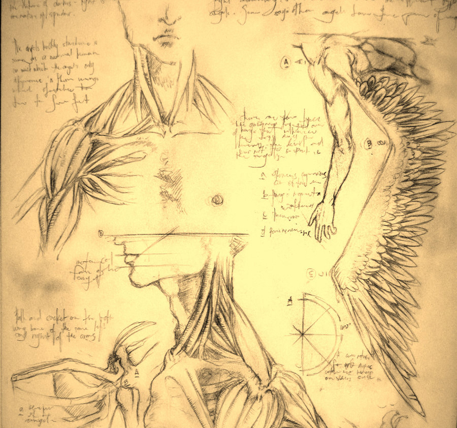 אבל עכשיו, כשהוא עומד בחדר השינה של האיש המבוגר, הוא חש שלא רק העור כולא את הכנפיים, אלא שהן מהודקות גם באיזה חוט שמעוות את כל גופו, כאילו שהוא אחת הדמויות המגולגלות בין שורות המחברת.