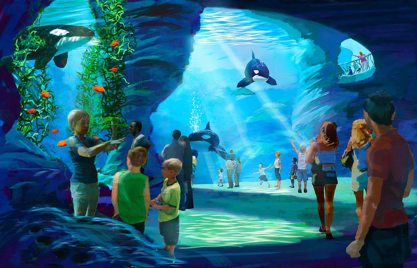 ואז, אחרי תרועת הפתיחה התפֵלה של מוזיקה ווידיאו וסְפַּנְדֶקְס אנדרוגיני מפזז, כשלווייתני הקטלן נכנסו סוף-סוף לזירה והתחילו בזינוקים, סיוורלד נמחק ונכתב מחדש בידי נוכחותם המוחלטת והמהרסת. בידי מעשה התפירה של שני עולמות יחד, שמיים ומים, רק לשם התענוג של אצטדיון מלא ילדים – ילדים שבתגובה זינקו גם הם ורעדו במושביהם וגרגרו באופן לא ברור, ובעצם דיברו בלשונות. ילדים אחרים, מבוגרים ואמיצים יותר מבנותיו, רצו למטה אל מעקה הפלסטיק כדי לחטוף רסס ולעמוד ולנופף בידיים. לווייתני הקטלן, עם עיני אמט קלי שלהם, היו ליצני הקטל המפוארים של אלוהים. גוף הקטיפה השרירי שלהם היה הדבר הכי חסר בושה שטבעוני בהתהוות ראה בחייו. כמו דובי פנדה שעוצבו מחדש בידי אלברט שְפֶּר. תמיד אזכורים של השואה. אמר פעם רנקר. למה שלא תשאיר את זה לנו?