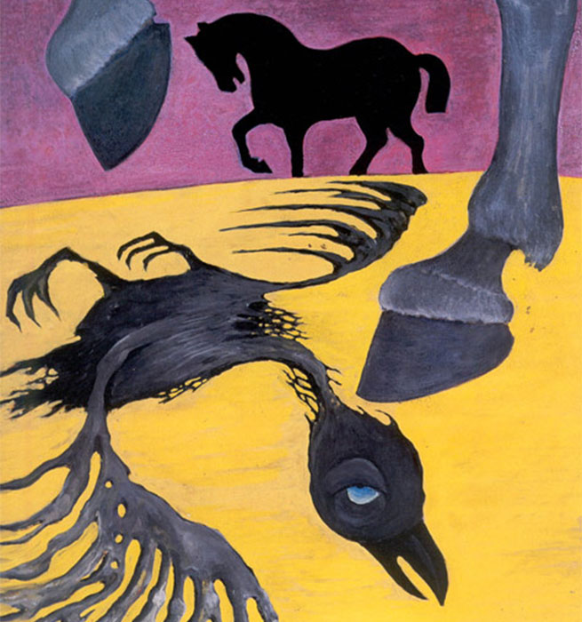 …ומיד נתפרקד הסוס ברחבה אצל העגלה ופנה למעלה מתגלגל ומתהפך מצדו אל צדו, כמו שמתעמלים במרחץ על האצטבא העליונה וצוהל מתוך רוב הנאה. רוח יתירה של יום-טוב נכנסה בו. ועד שהוא מתפלש בעפר, מין בריה מזדקר מתחתיו בקול יללה, והתנער מעפר בהול ומבוהל ועמד על רגליו. הוא מעמיד עיניו ואזניו, תוהא ומביט לכל רוחותיו והנה לפניו – כלב!