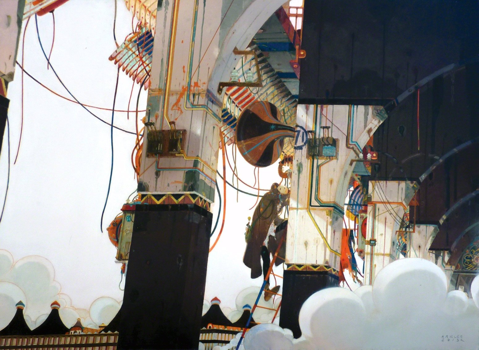 有一天晚上八點收攤的時候,魔術師收好小黑人跟魔術道具,對著我招了招手。我毫不猶豫地跟著他,心跳得很厲害,他一直往前走,直到穿過了天橋走到商場最後的角落,那裡有一道門,我知道那是通往商場天台的門,大人說不可以跑上去的地方。魔術師用手一轉鎖就開了,他招了招手要我上去。