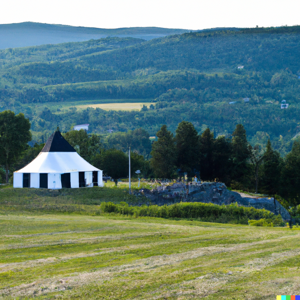 Pearl wandered to the back of the tent, where there were three generators buzzing and blowing. The tent sat on the middle plateau of a hill. At the top of the hill were two pillars set up for the ceremony. At the base of the hill there was a large field, a circle of stones, and a one- story-tall pile of wood for the bonfire which would follow the party. The house was also at the top of the hill, south of the pillars, an old clapboard house. A farmhouse? A big house, white with black shutters on a flat front. Both the house and the hill overlooked a vast undulating valley of Vermont forest, misty, cool and bright. In 23 years the view would be dappled with patches of taupe, where housing developments sprouted like clusters of mushrooms.