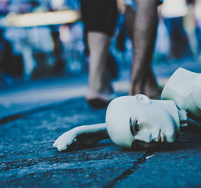 I was on my way to the bus stop when I saw the headless man. At first I thought it was a trick of the eye: I was wearing big dark glasses, possibly the head had been camouflaged by the dark trees behind the man. Surely, he couldn’t be headless. As I approached, however, I saw that he was indeed headless. There was scar tissue on his stump of neck and a little tube sticking out—for eating or breathing or both, I figured. He was wearing an orange tee shirt and he was tending the university grounds with a weed whacker. Geez, I thought. A headless man.