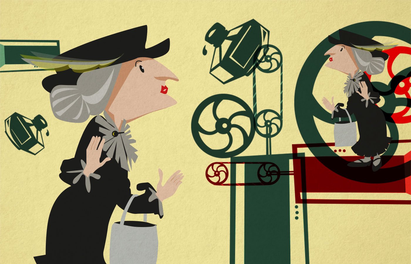 The old woman found herself in a large, light-filled room. She saw small tables in the room, and people sitting at the tables. Some of them had their noses buried in paper, writing something, while others tapped away at typewriters. It sounded like a smithy – only a pretend smithy.