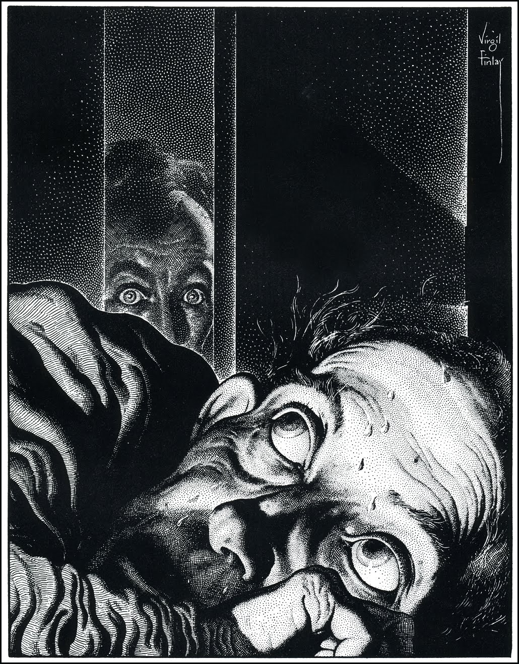 I went to the door at the end of the hall several times. The first time I heard the dragging of feet, as though he were scratching the floor. After that, I heard nothing more. I spied through the keyhole: it was dark, very dark, and quiet. I wondered what was in there. I tried to get in, but the door was locked.