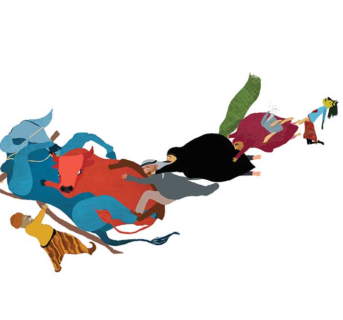 “Now that’s much better,” thought the horrible jinni, feeling content. But ten years of hunger is not something to be dismissed so quickly and so she left the house and walked out to the field. “Kunfoosa, what are you doing here? Where is my breakfast?” asked her step-father, who had been plowing the field all morning. “I ate it,” answered the jinni with a smile. “And now I am going to eat you, too!” The man assumed she was joking and answered with a smile, “Okay, my dear. You can eat me up right now if that’s what you want. “ And in a blink of an eye, without thinking twice, the jinni gobbled up the man and also swallowed his plow on its two oxen.